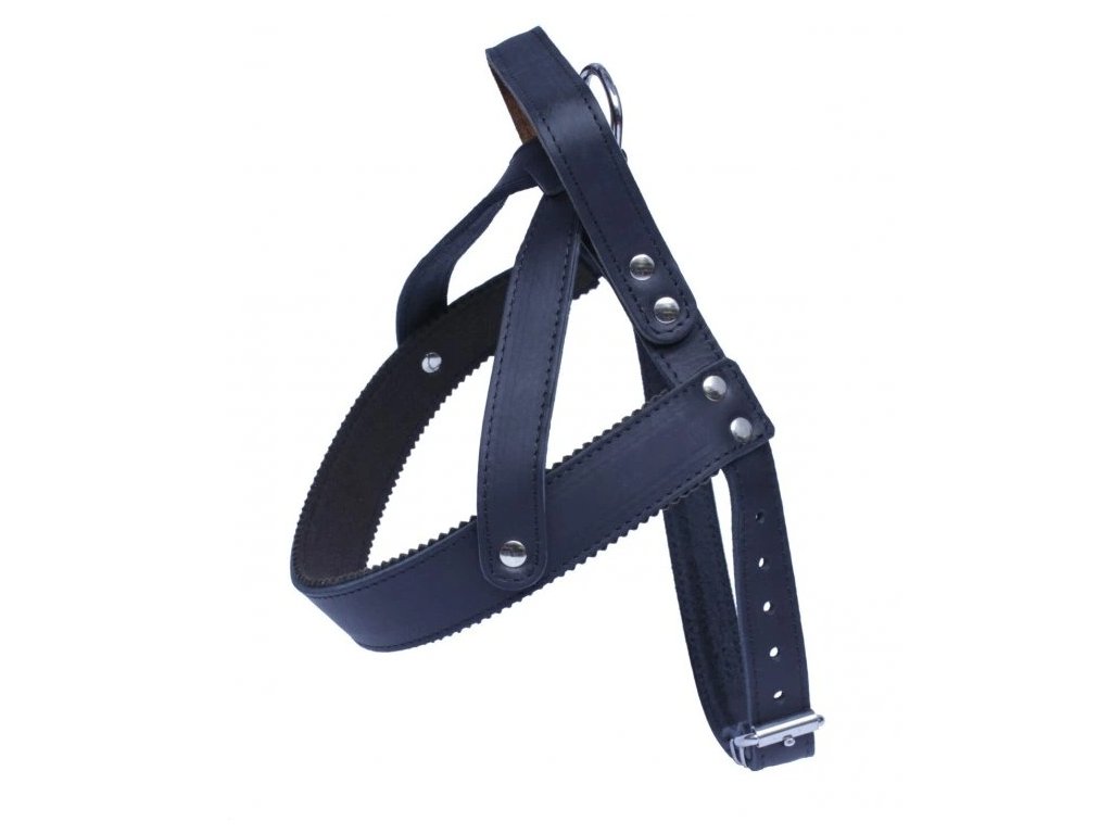Kožený postroj pro psa v černé barvě, podšitý zeleným filcem.